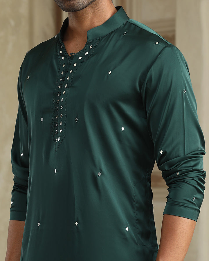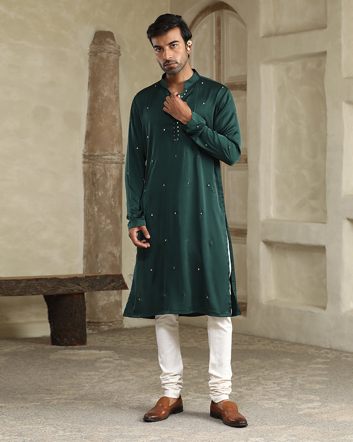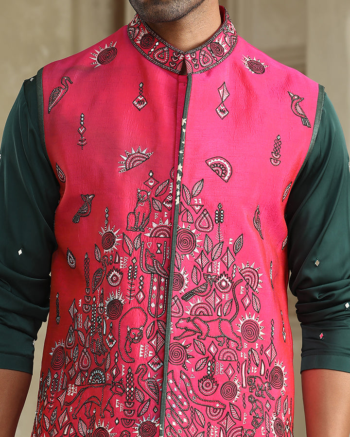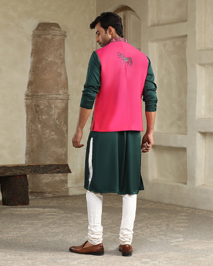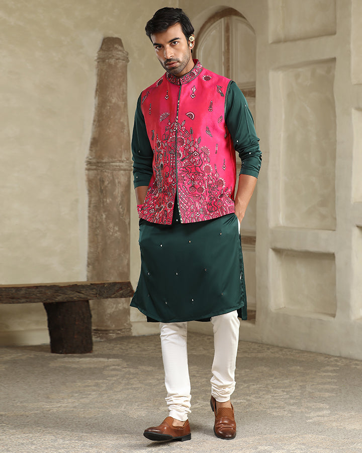 A rich dark green silk kurta with all-over mirror embroidery forms the base of this vibrant look, paired with an off-white lycra churidar for contrast. Layered with a statement bright pink Nehru jacket, heavily hand-embroidered using dori, mirror work, and intricate embellishments, the outfit is crafted for festive grandeur and celebratory charm. |