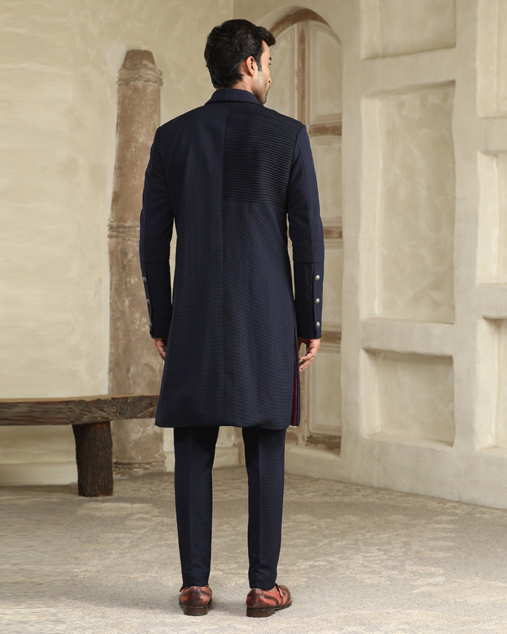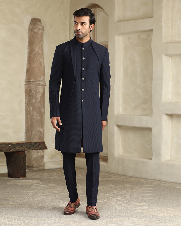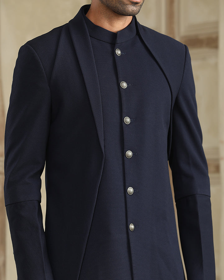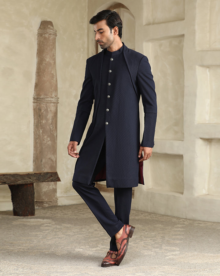 Crafted in a rich blue Italian textured viscose, this Indo set is a seamless blend of comfort and class. The silhouette features sharp panel detailing along the shoulders and neckline, adding structure and a regal edge. Paired with matching trousers in the same fabric and finished with pure metallic buttons, it’s a timeless ensemble for understated sophistication